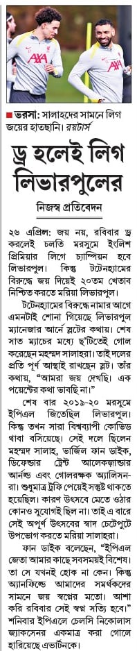 ২৬ এপ্রিল: জয় নয়, রবিবার ড্র করলেই চলতি মরসুমে ইংলিশ প্রিমিয়ার লিগে চ্যাম্পিয়ন হবে লিভারপুল। কিন্তু টটেনহ্যামের বিরুদ্ধে জয় দিয়েই ২০তম খেতাব নিশ্চিত করতে মরিয়া লিভারপুল।
