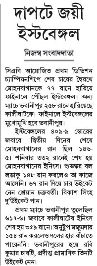 সিএবি আয়োজিত প্রথম ডিভিশন চ্যাম্পিয়নশিপে শেষ চারের দ্বৈরথে মোহনবাগানকে ৭৭ রানে হারিয়ে ফাইনালে পৌঁছল ইস্টবেঙ্গল। অন্য ম্যাচে ভবানীপুর ২৫৮ রানে হারিয়েছে কালীঘাটকে। ফাইনালে ইস্টবেঙ্গলের মুখোমুখি হবে ভবানীপুর।