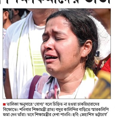 তালিকা অনুসারে ‘যোগ্য’ বলে চিহ্নিত না হওয়া চাকরিহারাদের বিক্ষোভে। শনিবার শিক্ষামন্ত্রী ব্রাত্য বসুর কালিন্দির বাড়িতে স্মারকলিপি জমা দেন তাঁরা। তবে শিক্ষামন্ত্রীর দেখা পাননি। ছবি: স্নেহাশিস ভট্টাচার্য