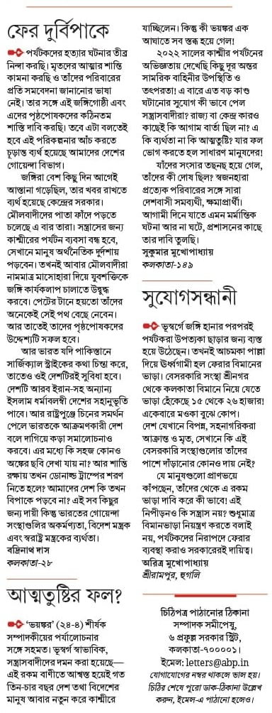 ২০২২ সালের কাশ্মীর পর্যটনের অভিজ্ঞতায় দেখেছি কিছু দূর অন্তর সামরিক বাহিনীর উপস্থিতি ও তৎপরতা! এ বারে এত বড় কাণ্ড ঘটানোর সুযোগ কী ভাবে পেল সন্ত্রাসবাদীরা? রাজ্য বা কেন্দ্র কারও কাছেই কি আগাম বার্তা ছিল না? এ কি ব্যর্থতা না কি আত্মতুষ্টি? যার ফল ভোগ করতে হল সাধারণ মানুষদের!
