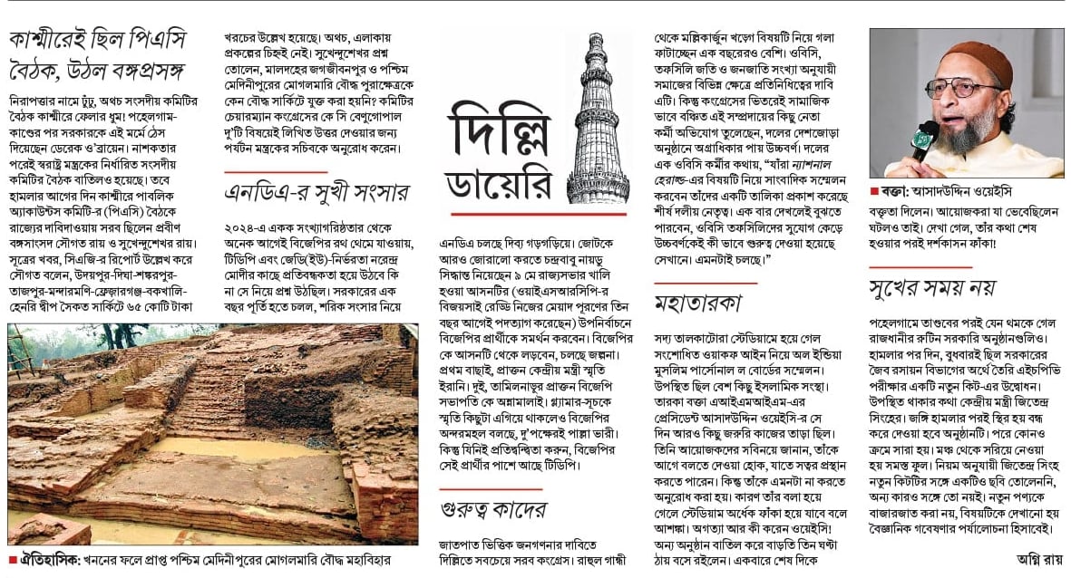 নিরাপত্তার নামে ঢুঁঢু, অথচ সংসদীয় কমিটির বৈঠক কাশ্মীরে ফেলার ধুম! পহেলগাম-কাণ্ডের পর সরকারকে এই মর্মে ঠেস দিয়েছেন ডেরেক ও’ব্রায়েন। নাশকতার পরেই স্বরাষ্ট্র মন্ত্রকের নির্ধারিত সংসদীয় কমিটির বৈঠক বাতিলও হয়েছে। তবে হামলার আগের দিন কাশ্মীরে পাবলিক অ্যাকাউন্টস কমিটি-র (পিএসি) বৈঠকে রাজ্যের দাবিদাওয়ায় সরব ছিলেন প্রবীণ বঙ্গসাংসদ সৌগত রায় ও সুখেন্দুশেখর রায়। সূত্রের খবর, সিএজি-র রিপোর্ট উল্লেখ করে সৌগত বলেন, উদয়পুর-দিঘা-শঙ্করপুর-তাজপুর-মন্দারমণি-ফ্রেজ়ারগঞ্জ-বকখালি-হেনরি দ্বীপ সৈকত সার্কিটে ৬৫ কোটি টাকা খরচের উল্লেখ হয়েছে। অথচ, এলাকায় প্রকল্পের চিহ্নই নেই। সুখেন্দুশেখর প্রশ্ন তোলেন, মালদহের জগজীবনপুর ও পশ্চিম মেদিনীপুরের মোগলমারি বৌদ্ধ পুরাক্ষেত্রকে কেন বৌদ্ধ সার্কিটে যুক্ত করা হয়নি? কমিটির চেয়ারম্যান কংগ্রেসের কে সি বেণুগোপাল দু’টি বিষয়েই লিখিত উত্তর দেওয়ার জন্য পর্যটন মন্ত্রকের সচিবকে অনুরোধ করেন।
