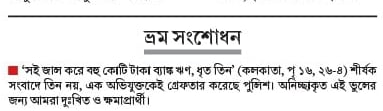 ‘সই জাল করে বহু কোটি টাকা ব্যাঙ্ক ঋণ, ধৃত তিন’ (কলকাতা, পৃ ১৬, ২৬-৪) শীর্ষক সংবাদে তিন নয়, এক অভিযুক্তকেই গ্রেফতার করেছে পুলিশ। অনিচ্ছাকৃত এই ভুলের জন্য আমরা দুঃখিত ও ক্ষমাপ্রার্থী।