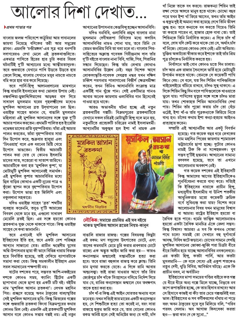 ষাটের দশকের পরে, সম্ভবত আশি-নব্বইয়ের দশকে কোনও সময়, ক্যানিং স্ট্রিটের একটি ছাপাখানা থেকে ছাপা হয় একটি চটি বই। বইটির নাম ‘মুশকিল আসান ব্রতকথা’। লেখক মহসিন পির। প্রচ্ছদে রয়েছে অবন ঠাকুরের বাল্যস্মৃতির সেই মুশকিল আসানের ছবি। কিন্তু ভিতরের গল্পের সঙ্গে গুজরাতি ব্রতকথা কিংবা বিক্রমপুরের কথার কোনও মিল নেই। এমনকি এই ব্রতকথাটি মুশকিল আসান বলে কোনও সত্তার গল্পই নয়। এই নতুন আখ্যানের উপাসনার কেন্দ্রবিন্দু হচ্ছেন আসানবিবি।