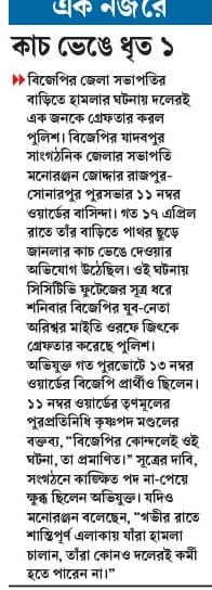 }} বিজেপির জেলা সভাপতির বাড়িতে হামলার ঘটনায় দলেরই এক জনকে গ্রেফতার করল পুলিশ। বিজেপির যাদবপুর সাংগঠনিক জেলার সভাপতি মনোরঞ্জন জোদ্দার রাজপুর-সোনারপুর পুরসভার ১১ নম্বর ওয়ার্ডের বাসিন্দা। গত ১৭ এপ্রিল রাতে তাঁর বাড়িতে পাথর ছুড়ে জানলার কাচ ভেঙে দেওয়ার অভিযোগ উঠেছিল। ওই ঘটনায় সিসিটিভি ফুটেজের সূত্র ধরে শনিবার বিজেপির যুব-নেতা অরিশ্বর মাইতি ওরফে জিৎকে গ্রেফতার করেছে পুলিশ। অভিযুক্ত গত পুরভোটে ১৩ নম্বর ওয়ার্ডের বিজেপি প্রার্থীও ছিলেন। ১১ নম্বর ওয়ার্ডের তৃণমূলের পুরপ্রতিনিধি কৃষ্ণপদ মণ্ডলের বক্তব্য, “বিজেপির কোন্দলেই ওই ঘটনা, তা প্রমাণিত।” সূত্রের দাবি, সংগঠনে কাঙ্ক্ষিত পদ না-পেয়ে ক্ষুব্ধ ছিলেন অভিযুক্ত। যদিও মনোরঞ্জন বলেছেন, “গভীর রাতে শান্তিপূর্ণ এলাকায় যাঁরা হামলা চালান, তাঁরা কোনও দলেরই কর্মী হতে পারেন না।”