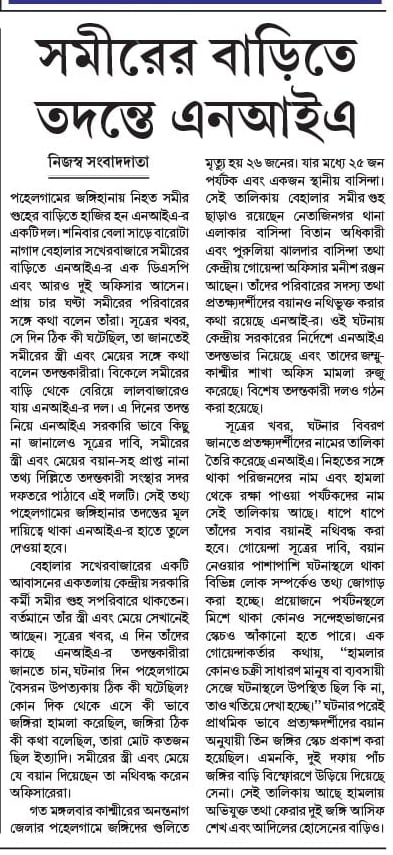 গত মঙ্গলবার কাশ্মীরের অনন্তনাগ জেলার পহেলগামে জঙ্গিদের গুলিতে মৃত্যু হয় ২৬ জনের। যার মধ্যে ২৫ জন পর্যটক এবং একজন স্থানীয় বাসিন্দা। সেই তালিকায় বেহালার সমীর গুহ ছাড়াও রয়েছেন নেতাজিনগর থানা এলাকার বাসিন্দা বিতান অধিকারী এবং পুরুলিয়া ঝালদার বাসিন্দা তথা কেন্দ্রীয় গোয়েন্দা অফিসার মনীশ রঞ্জন আছেন। তাঁদের পরিবারের সদস্য তথা প্রতক্ষ্যদর্শীদের বয়ানও নথিভুক্ত করার কথা রয়েছে এনআই-র। ওই ঘটনায় কেন্দ্রীয় সরকারের নির্দেশে এনআইএ তদন্তভার নিয়েছে এবং তাদের জম্মু-কাশ্মীর শাখা অফিস মামলা রুজু করেছে। বিশেষ তদন্তকারী দলও গঠন করা হয়েছে।