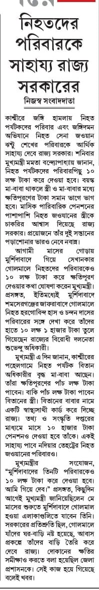 কাশ্মীরে জঙ্গি হামলায় নিহত পর্যটকদের পরিবার এবং জঙ্গিদমন অভিযানে নিহত সেনা জওয়ান ঝন্টু শেখের পরিবারকে আর্থিক সাহায্য দেবে রাজ্য সরকার। শনিবার মুখ্যমন্ত্রী মমতা বন্দ্যোপাধ্যায় জানান, নিহত পর্যটকদের পরিবারপিছু ১০ লক্ষ টাকা করে দেওয়া হবে। বয়স্ক মা-বাবা থাকলে স্ত্রী ও মা-বাবার মধ্যে ক্ষতিপূরণের টাকা সমান ভাগে ভাগ হবে। মাসিক পারিবারিক পেনশনের পাশাপাশি নিহত জওযানের স্ত্রীকে চাকরির আশ্বাস দিয়েছে রাজ্য সরকার। প্রয়োজনে তাঁর দুই সন্তানের পড়াশোনার ভারও নেবে নবান্ন।