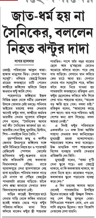 পহেলগামে জঙ্গিহানা ইস্তক বিভিন্ন মহল থেকে ধর্মীয় মেরুকরণ উসকে তোলার চেষ্টা চলছে। শনিবার ভাইয়ের মরদেহ কবর দেওয়ার আগেই ঝন্টুর দাদা, কাশ্মীরে কর্মরত ভারতীয় সেনার সুবেদার রফিকুল শেখ বলেন, “সৈনিকের আবার ধর্ম কী? সৈনিকের জাতধর্ম হয় না। ভারতীয় সেনা হিন্দু, মুসলিম, খ্রিস্টান, শিখ—সবাইকে নিয়ে তৈরি। ”