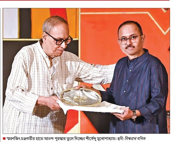 স্মরণজিৎ চক্রবর্তীর হাতে আনন্দ পুরস্কার তুলে দিচ্ছেন শীর্ষেন্দু মুখোপাধ্যায়। ছবি: বিশ্বনাথ বণিক