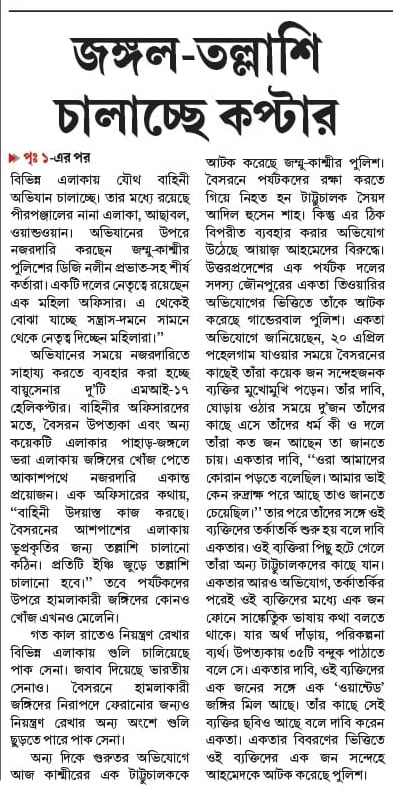 অভিযানের সময়ে নজরদারিতে সাহায্য করতে ব্যবহার করা হচ্ছে বায়ুসেনার দু’টি এমআই-১৭ হেলিকপ্টার। বাহিনীর অফিসারদের মতে, বৈসরন উপত্যকা এবং অন্য কয়েকটি এলাকার পাহাড়-জঙ্গলে ভরা এলাকায় জঙ্গিদের খোঁজ পেতে আকাশপথে নজরদারি একান্ত প্রয়োজন। এক অফিসারের কথায়, ‘‘বাহিনী উদয়াস্ত কাজ করছে। বৈসরনের আশপাশের এলাকায় ভূপ্রকৃতির জন্য তল্লাশি চালানো কঠিন। প্রতিটি ইঞ্চি জুড়ে তল্লাশি চালানো হবে।’’ তবে পর্যটকদের উপরে হামলাকারী জঙ্গিদের কোনও খোঁজ এখনও মেলেনি।