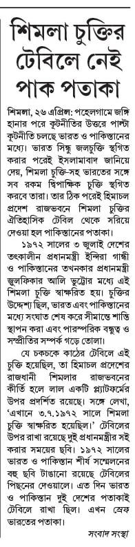 শিমলা, ২৬ এপ্রিল: পহেলগামে জঙ্গি হানার পরে কূটনীতির উত্তরে পাল্টা কূটনীতি চলছে ভারত ও পাকিস্তানের মধ্যে। ভারত সিন্ধু জলচুক্তি স্থগিত করার পরেই ইসলামাবাদ জানিয়ে দেয়, শিমলা চুক্তি-সহ ভারতের সঙ্গে সব রকম দ্বিপাক্ষিক চুক্তি স্থগিত করবে তারা। তার ঠিক পরেই হিমাচল প্রদেশ রাজভবনে শিমলা চুক্তির ঐতিহাসিক টেবিল থেকে সরিয়ে দেওয়া হল পাকিস্তানের পতাকা।
