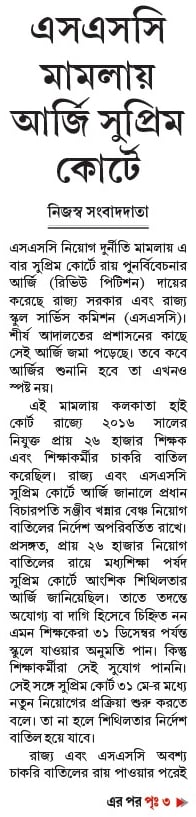 স্কুল সার্ভিস কমিশন (এসএসসি)। শীর্ষ আদালতের প্রশাসনের কাছে সেই আর্জি জমা পড়েছে। তবে কবে আর্জির শুনানি হবে তা এখনও