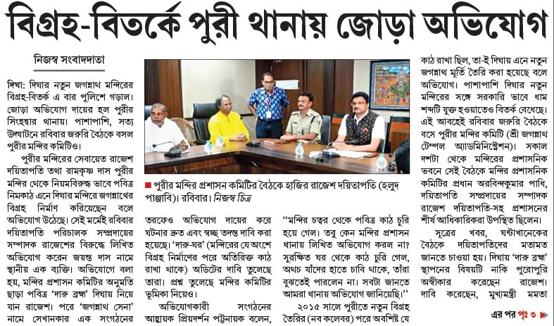 ২০১৫ সালে পুরীতে নতুন বিগ্রহ তৈরির (নব কলেবর) পরে অবশিষ্ট যে কাঠ রাখা ছিল, তা-ই দিঘায় এনে নতুন জগন্নাথ মূর্তি তৈরি করা হয়েছে বলে অভিযোগ। পাশাপাশি দিঘার নতুন মন্দিরের সঙ্গে সরকারি ভাবে ধাম শব্দটি যুক্ত হওয়াতেও বিতর্ক বেধেছে। এই আবহেই রবিবার জরুরি বৈঠকে বসে পুরীর মন্দির কমিটি (শ্রী জগন্নাথ টেম্পল অ্যাডমিনিস্ট্রেশন)। সকাল দশটা থেকে মন্দিরের প্রশাসনিক ভবনে সেই বৈঠকে মন্দির প্রশাসনিক কমিটির প্রধান অরবিন্দকুমার পাধি, দয়িতাপতি সম্প্রদায়ের সম্পাদক রাজেশ দয়িতাপতি-সহ প্রশাসনের শীর্ষ আধিকারিকরা উপস্থিত ছিলেন।