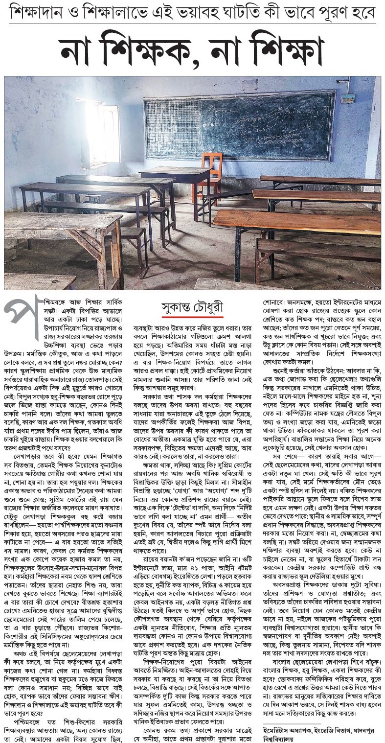 পশ্চিমবঙ্গে আজ শিক্ষার সার্বিক সঙ্কট। একটা বিপত্তির আড়ালে আর একটা ঢাকা পড়ে যাচ্ছে। উপাচার্য নিয়োগ নিয়ে রাজ্যপাল ও রাজ্য সরকারের লজ্জাকর তরজায় উচ্চশিক্ষা ব্যবস্থা ভেঙে পড়ার উপক্রম। মর্মান্তিক কৌতুক, আজ এ কথা পাড়লে লোকে বলবে, এ সব প্রশ্ন তুলে নজর ঘোরাচ্ছ কেন? কারণ স্কুলশিক্ষায় প্রাথমিক থেকে উচ্চ মাধ্যমিক সর্বস্তরে ধারাবাহিক অনাচারে রাজ্য তোলপাড়। সেই বিপর্যয়েরও একটা দিক এই মুহূর্তে কারও গোচরে নেই। বিপুল সংখ্যক হবু-শিক্ষক বছরভর রোদে পুড়ে জলে ভিজে রাস্তা কামড়ে আছেন, কোনও দিনই চাকরি পাননি বলে। তাঁদের কথা আমরা ভুলতে বসেছি, কারণ আর এক দল শিক্ষক, গতকাল অবধি যাঁরা প্রথম দলের ঈর্ষার পাত্র ছিলেন, তাঁরাও আজ চাকরি খুইয়ে রাস্তায়। শিক্ষক হওয়ার বদখেয়ালে কি তরুণ প্রজন্মটাই পথে বসবে?