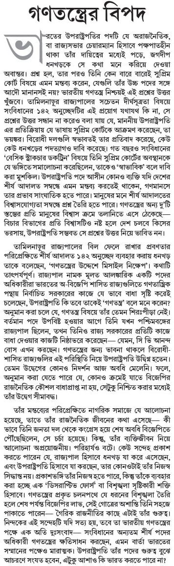 তামিলনাড়ুর রাজ্যপালের বিল ফেলে রাখার প্রবণতার পরিপ্রেক্ষিতে শীর্ষ আদালত ১৪২ অনুচ্ছেদ ব্যবহার করায় ধনখড় তাকে বলেছেন, ‘গণতন্ত্রের উদ্দেশে মিসাইল নিক্ষেপ’। কথাটি তাৎপর্যপূর্ণ। রাজ্যপাল নামক মূলত আলঙ্কারিক একটি পদের অধিকারীরা ভারতের অ-বিজেপি শাসিত রাজ্যগুলিতে গণতান্ত্রিক পন্থায় নির্বাচিত সরকারের কাজে যে ভাবে বাধা সৃষ্টি করেই চলেছেন, উপরাষ্ট্রপতি কি তবে তাকেই ‘গণতন্ত্র’ বলে মনে করেন? অনুমান করা চলে যে, গণতন্ত্র বিষয়ে তাঁর তেমন শিরঃপীড়া নেই। বর্তমান পদে উপবিষ্ট হওয়ার আগে তিনি যখন পশ্চিমবঙ্গের রাজ্যপাল ছিলেন, তখন তিনিও রাজ্য সরকারের প্রতিটি কাজে বাধা দেওয়ার কাজটি নিষ্ঠাভরে করেছেন— যেমন, সি ভি আনন্দ বোস এখন করছেন। গণতন্ত্রের জন্য ভাবনা থাকলে বিরোধী-শাসিত রাজ্যগুলির এই পরিস্থিতি নিয়ে উপরাষ্ট্রপতি উদ্বিগ্ন হতেন। তেমন উদ্বেগের কোনও নিদর্শন আজ অবধি মেলেনি। ফলে, অনুমান করা যেতে পারে যে, কোনও ক্রমেই যাতে বিজেপির রাজনৈতিক কৌশল বাধাপ্রাপ্ত না হয়, সেটুকু নিশ্চিত করার মধ্যেই তাঁর উদ্বেগ সীমাবদ্ধ।