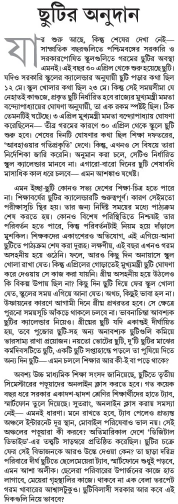 অবশ্য উচ্চ মাধ্যমিক শিক্ষা সংসদ জানিয়েছে, ছুটিতে তৃতীয় সিমেস্টারের পড়ুয়াদের অনলাইন ক্লাস করতে হবে। গত কয়েক বছর ধরে সরকার একাদশ-দ্বাদশ শ্রেণির শিক্ষার্থীদের হাতে ট্যাব, স্মার্টফোন তুলে দিয়েছে। সুতরাং, অনলাইন ক্লাস করায় সমস্যা নেই— এমনই ধারণা। মনে রাখতে হবে, ট্যাব পেলেও প্রত্যন্ত অঞ্চলে ইন্টারনেট দূর স্থান, মোবাইল পরিষেবাও ভাল নয়। সেই অঞ্চলের পড়ুয়ারা কী করবে? অতিমারিকাল দেশে ‘ডিজিটাল ডিভাইড’-এর তত্ত্বটি সাড়ম্বরে প্রতিষ্ঠিত করেছিল। ছুটির চক্রে ফের সেই বিভাজনকে আরও উস্কে দেওয়া কেন? তা ছাড়া দরিদ্র পরিবারে দীর্ঘ ছুটিতে ছেলেমেয়েরা ট্যাব, স্মার্টফোনে শুধুই পড়বে, এমন আশা অলীক। ছেলেরা পরিবারের উপার্জনের কাজে হাত লাগাবে, মেয়েরা গৃহস্থালির কাজে। থাকবে না এক বেলা ভরপেট গরম খাবারের আশ্বাসটুকুও। ছুটিবিলাসী সরকার আর কবে এই দিকগুলি নিয়ে ভাববে?