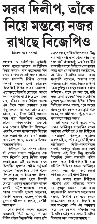 খোদ দিলীপ অবশ্য রয়েছেন মেজাজেই! তিনি বলেছেন, “দলের নীতির বাইরে কিছু করিনি। দল যা খুশি বলতে পারে, শাস্তিও দিতে পারে। কিছু যায় আসে না! কাল থেকে আর কিছু বলব না।” যদিও অর্জুন এক ‘বেআইনি ব্যবসায়ী’র সঙ্গে দিলীপের যোগাযোগ আছে বলে যে অভিযোগ করেছিলেন, তা নিয়ে বিজেপির প্রাক্তন রাজ্য সভাপতি বলেছেন, “লালার সঙ্গে অর্জুনের যোগ আছে, নিয়মিত টাকা নেন। দুর্গাপুরের রাজু (কয়লা কারবারে অভিযুক্ত), যাঁকে খুন করা হল, উনি ওঁরই চেলা ছিলেন!” ‘নব্য বিজেপি’র মুখোশ খুলে দেওয়ার হুঁশিয়ারি দিয়ে দিলীপের আরও বক্তব্য, “কে কালো গরুর দুধ খান, কে পাথরের মূর্তি বিক্রি করেন, কে বালি খাদান খুঁড়ে বেড়ান? সব বলতে আরম্ভ করব।”