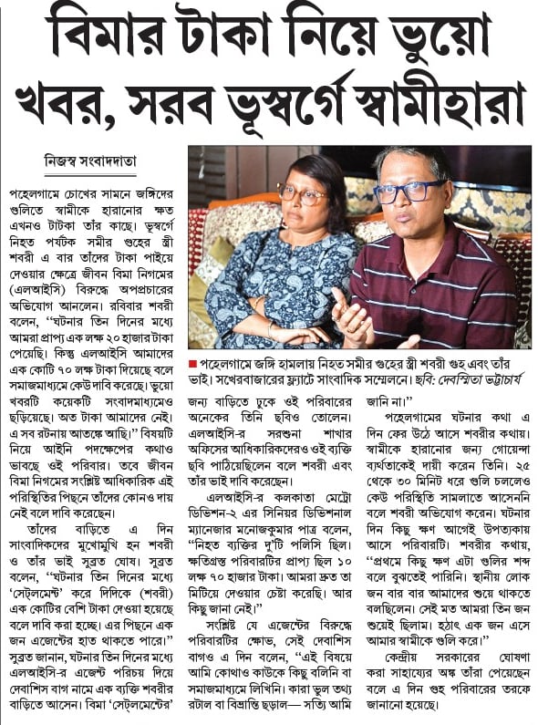 পহেলগামে চোখের সামনে জঙ্গিদের গুলিতে স্বামীকে হারানোর ক্ষত এখনও টাটকা তাঁর কাছে। ভূস্বর্গে নিহত পর্যটক সমীর গুহের স্ত্রী শবরী এ বার তাঁদের টাকা পাইয়ে দেওয়ার ক্ষেত্রে জীবন বিমা নিগমের (এলআইসি) বিরুদ্ধে অপপ্রচারের অভিযোগ আনলেন। রবিবার শবরী বলেন, ‘‘ঘটনার তিন দিনের মধ্যে আমরা প্রাপ্য এক লক্ষ ২০ হাজার টাকা পেয়েছি। কিন্তু এলআইসি আমাদের এক কোটি ৭০ লক্ষ টাকা দিয়েছে বলে সমাজমাধ্যমে কেউ দাবি করেছে। ভুয়ো খবরটি কয়েকটি সংবাদমাধ্যমেও ছড়িয়েছে। অত টাকা আমাদের নেই। এ সব রটনায় আতঙ্কে আছি।’’ বিষয়টি নিয়ে আইনি পদক্ষেপের কথাও ভাবছে ওই পরিবার। তবে জীবন বিমা নিগমের সংশ্লিষ্ট আধিকারিক এই পরিস্থিতির পিছনে তাঁদের কোনও দায় নেই বলে দাবি করেছেন।