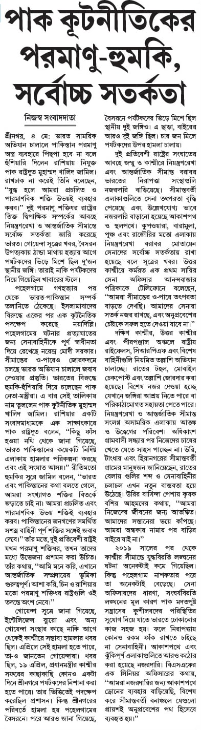 শ্রীনগর, ৪ মে: ভারত সামরিক অভিযান চালালে পাকিস্তান পরমাণু অস্ত্র ব্যবহারে পিছপা হবে না বলে হুঁশিয়ারি দিলেন রাশিয়ায় নিযুক্ত পাক রাষ্ট্রদূত মুহাম্মদ খালিদ জামিল। রাখঢাক না করেই তিনি বলেছেন, ‘‘যুদ্ধ হলে আমরা প্রচলিত ও পারমাণবিক শক্তি উভয়ই ব্যবহার করব।’’ দুই পরমাণু শক্তিধর রাষ্ট্রের তিক্ত দ্বিপাক্ষিক সম্পর্কের আবহে নিয়ন্ত্রণরেখা ও আন্তর্জাতিক সীমান্তে সর্বোচ্চ সতর্কতা জারি করেছে ভারত। গোয়েন্দা সূত্রের খবর, বৈসরন উপত্যকায় ঠান্ডা মাথায় হত্যার আগে পর্যটকদের ভিড়ে মিশে ছিল দু’জন স্থানীয় জঙ্গি। তারাই নাকি পর্যটকদের নিয়ে গিয়েছিল খাবারের স্টলে।