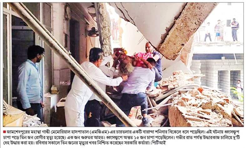জামশেদপুরের মহাত্মা গান্ধী মেমোরিয়াল হাসপাতাল (এমজিএম)-এর চারতলার একটি বারান্দা শনিবার বিকেলে ধসে পড়েছিল। এই ঘটনায় ধ্বংসস্তূপ চাপা পড়ে তিন জন রোগীর মৃত্যু হয়েছে। এক জন গুরুতর আহত। ধ্বংসস্তূপে অন্তত ১৫ জন চাপা পড়েছিলেন। গভীর রাত পর্যন্ত উদ্ধারকাজ চালিয়ে দু’টি দেহ উদ্ধার করা হয়। রবিবার সকালে তিন জনের মৃত্যুর খবর নিশ্চিত করেছেন সরকারি কর্তারা। পিটিআই