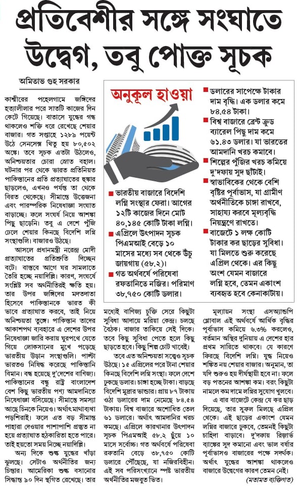 তবে এত অনিশ্চয়তা সত্ত্বেও সূচক উঠছে। ১৫ এপ্রিলের পরে টানা শেয়ার কিনছে বিদেশি লগ্নি সংস্থা। ফলে দেশে ঢুকছে ডলার। চাঙ্গা হচ্ছে টাকা। বাড়ছে বিদেশি মুদ্রার ভান্ডার। প্রায় ৮৭ টাকায় ওঠা ডলারের দাম নেমেছে ৮৪.৫৪ টাকায়। বিশ্ব বাজারে অশোধিত তেল ৬১ ডলারে। অর্থাৎ আমদানির খরচ কমছে। এপ্রিলে কারখানার উৎপাদন সূচক পিএমআই ৫৮.২ ছুঁয়ে ১০ মাসে সর্বোচ্চ। গত অর্থবর্ষে পরিষেবা রফতানি বেড়ে ৩৮,৭৫০ কোটি ডলারে পৌঁছেছে, যা নজিরবিহীন। এই সব পরিসংখ্যানে স্পষ্ট ভারতীয় অর্থনীতির মজবুত ভিত।