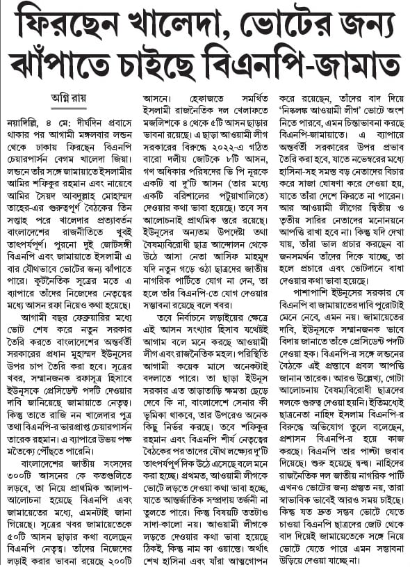নয়াদিল্লি, ৪ মে: দীর্ঘদিন প্রবাসে থাকার পর আগামী মঙ্গলবার লন্ডন থেকে ঢাকায় ফিরছেন বিএনপি চেয়ারপার্সন বেগম খালেদা জিয়া। লন্ডনে তাঁর সঙ্গে জামায়াতে ইসলামীর আমির শফিকুর রহমান এবং নায়েবে আমির সৈয়দ আবদুল্লাহ মোহাম্মদ তাহের-এর গুরুত্বপূর্ণ বৈঠকের তিন সপ্তাহ পরে খালেদার প্রত্যাবর্তন বাংলাদেশের রাজনীতিতে খুবই তাৎপর্যপূর্ণ। পুরনো দুই জোটসঙ্গী বিএনপি এবং জামায়াতে ইসলামী এ বার যৌথভাবে ভোটের জন্য ঝাঁপাতে পারে। কূটনৈতিক সূত্রের মতে এ ব্যাপারে তাঁদের নিজেদের নেতৃত্বের মধ্যে আসন রফা নিয়েও কথা হয়েছে।