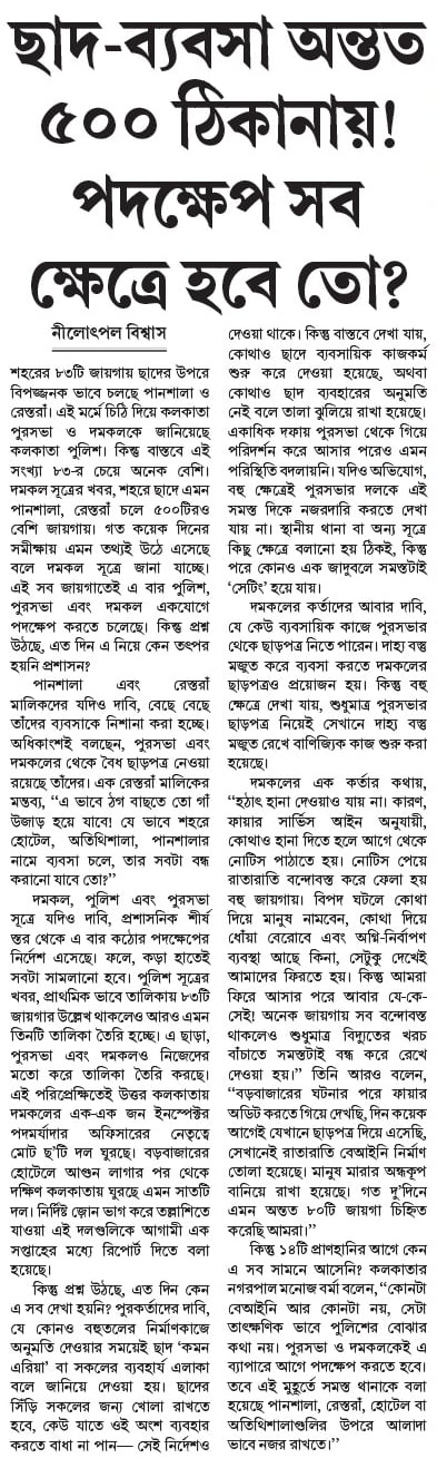 শহরের ৮৩টি জায়গায় ছাদের উপরে বিপজ্জনক ভাবে চলছে পানশালা ও রেস্তরাঁ। এই মর্মে চিঠি দিয়ে কলকাতা পুরসভা ও দমকলকে জানিয়েছে কলকাতা পুলিশ। কিন্তু বাস্তবে এই সংখ্যা ৮৩-র চেয়ে অনেক বেশি। দমকল সূত্রের খবর, শহরে ছাদে এমন পানশালা, রেস্তরাঁ চলে ৫০০টিরও বেশি জায়গায়। গত কয়েক দিনের সমীক্ষায় এমন তথ্যই উঠে এসেছে বলে দমকল সূত্রে জানা যাচ্ছে। এই সব জায়গাতেই এ বার পুলিশ, পুরসভা এবং দমকল একযোগে পদক্ষেপ করতে চলেছে। কিন্তু প্রশ্ন উঠছে, এত দিন এ নিয়ে কেন তৎপর হয়নি প্রশাসন?
