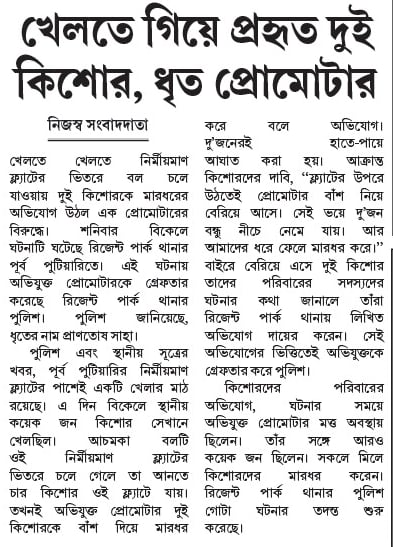 ভিতরে চলে গেলে তা আনতে চার কিশোর ওই ফ্ল্যাটে যায়। তখনই অভিযুক্ত প্রোমোটার দুই কিশোরকে বাঁশ দিয়ে মারধর