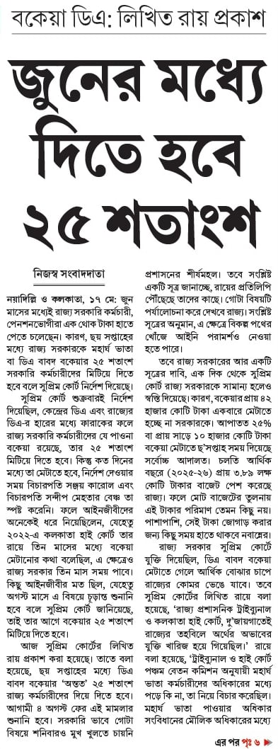 নয়াদিল্লি ও কলকাতা, ১৭ মে: জুন মাসের মধ্যেই রাজ্য সরকারি কর্মচারী, পেনশনভোগীরা এক থোক টাকা হাতে পেতে চলেছেন। কারণ, ছয় সপ্তাহের মধ্যে রাজ্য সরকারকে মহার্ঘ ভাতা বা ডিএ বাবদ বকেয়ার ২৫ শতাংশ সরকারি কর্মচারীদের মিটিয়ে দিতে হবে বলে সুপ্রিম কোর্ট নির্দেশ দিয়েছে।