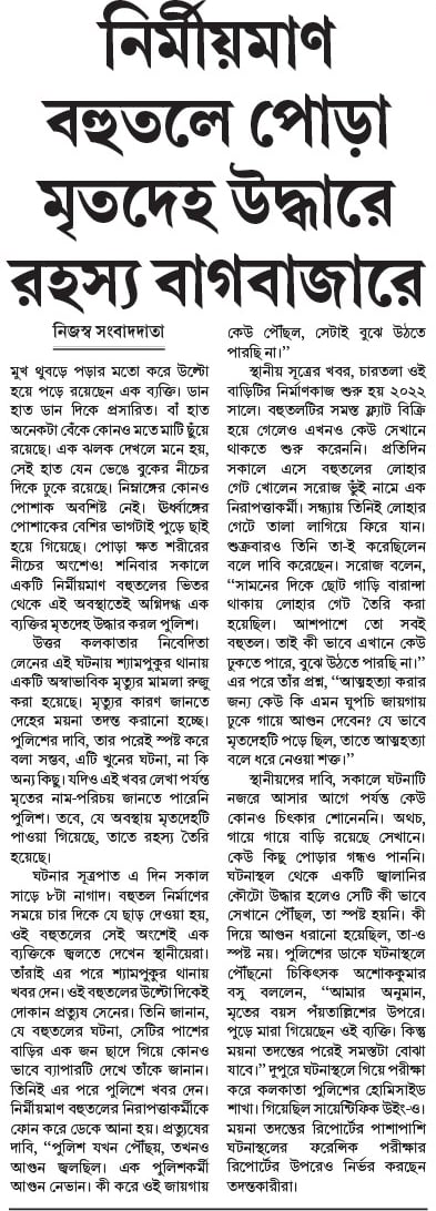 নির্মীয়মাণ বহুতলে পোড়া মৃতদেহ উদ্ধারে রহস্য বাগবাজারে