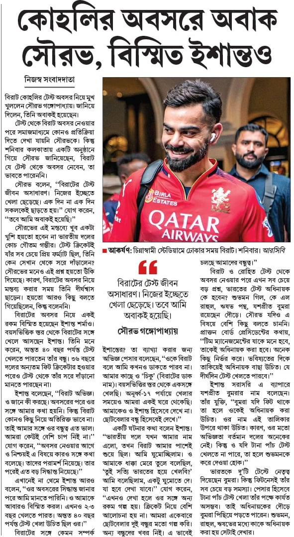 টেস্ট থেকে বিরাট অবসর নেওয়ার পরে সমাজমাধ্যমে কোনও প্রতিক্রিয়া দিতে দেখা যায়নি সৌরভকে। কিন্তু শনিবার কলকাতায় একটি অনুষ্ঠানে গিয়ে সৌরভ জানিয়েছেন, বিরাট যে টেস্ট থেকে অবসর নেবেন, তা