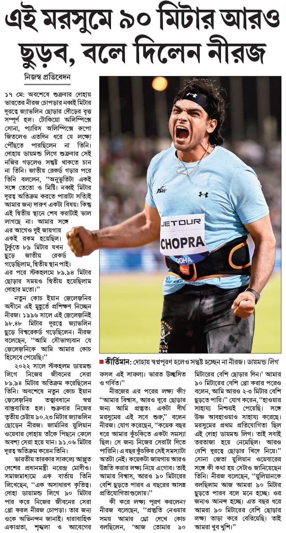 ২০২২ সালে স্টকহলম ডায়মন্ড লিগে নিজের জীবনের সেরা ৮৯.৯৪ মিটার অতিক্রম করেছিলেন তিনি। অবশেষে নতুন কোচ ইয়ান জ়েলেজ়নির তত্ত্বাবধানে স্বপ্ন বাস্তবায়িত হল। শুক্রবার নিজের তৃতীয় চেষ্টায় ৯০.২৩ মিটার জ্যাভলিন ছোড়েন নীরজ। জার্মানির য়ুলিয়ান ওয়েবার দোহায় তাঁকে পিছনে ফেলে অবশ্য সেরা হয়ে যান। ৯১.০৬ মিটার দূরত্ব অতিক্রম করেন তিনি।