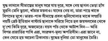 যুদ্ধ লাগলে সীমান্তের মানুষ সরে যায় দূরে, সঙ্গে নেয় ছাগল ভেড়া হাঁস মুরগি মেনি ভুলো, খাঁচার ময়নাও। যাদের নেয় না, তারা পড়ে থাকে বিপদের মুখে। ভারত-পাক সীমান্তে প্রবল গুলিগোলার মাঝে সম্প্রতি নয়টি গ্রেট ইন্ডিয়ান বাস্টার্ড ছানাকে সরিয়ে নিতে হল জয়সলমের থেকে দু’শো কিমি দূরে, অজমেরে। বয়স পাঁচ থেকে আটাশ দিন— অতি বিপন্ন প্রজাতির পাখি এরা, সংরক্ষণ-মূল্য অপরিসীম। এরা জানে না, কেন যেতে হয় অচেনা ঠিকানায়। যুদ্ধের দুনিয়া তো মানুষের তৈরি।