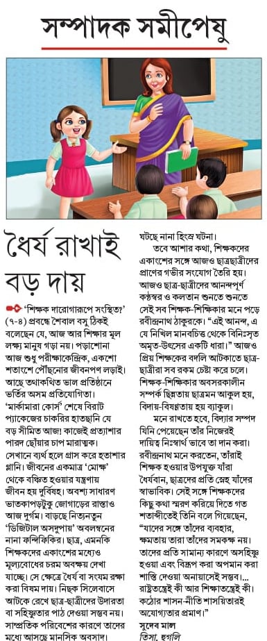 ‘শিক্ষক দারোগারূপে সংস্থিত?’ (৭-৪) প্রবন্ধে শৈবাল বসু ঠিকই বলেছেন যে, আজ আর শিক্ষার মূল লক্ষ্য মানুষ গড়া নয়। পড়াশোনা আজ শুধু পরীক্ষাকেন্দ্রিক, একশো শতাংশে পৌঁছনোর জীবনপণ লড়াই। আছে তথাকথিত ভাল প্রতিষ্ঠানে ভর্তির অসম প্রতিযোগিতা। ‘মার্কামারা কোর্স’ শেষে বিরাট প্যাকেজের চাকরির হাতছানি যে বড় সীমিত আজ! কাজেই প্রত্যাশার পারদ ছোঁয়ার চাপ মারাত্মক। সেখানে ব্যর্থ হলে গ্রাস করে হতাশার গ্লানি। জীবনের একমাত্র ‘মোক্ষ’ থেকে বঞ্চিত হওয়ার যন্ত্রণায় জীবন হয় দুর্বিষহ। অবশ্য সাধারণ ভাতকাপড়টুকু জোগাড়ের রাস্তাও আজ দুর্গম। বাড়ছে নিত্যনতুন ‘ডিজিটাল অসদুপায়’ অবলম্বনের নানা ফন্দিফিকির। ছাত্র, এমনকি শিক্ষকদের একাংশের মধ্যেও মূল্যবোধের চরম অবক্ষয় দেখা যাচ্ছে। সে ক্ষেত্রে ধৈর্য বা সংযম রক্ষা করা বিষম দায়। নিছক সিলেবাসে আটকে রেখে ছাত্র-ছাত্রীদের উদারতা বা সহিষ্ণুতার পাঠ দেওয়া সম্ভব নয়। সাম্প্রতিক পরিবেশের কারণে তাদের মধ্যে আসছে মানসিক অবসাদ। ঘটছে নানা হিংস্র ঘটনা।
