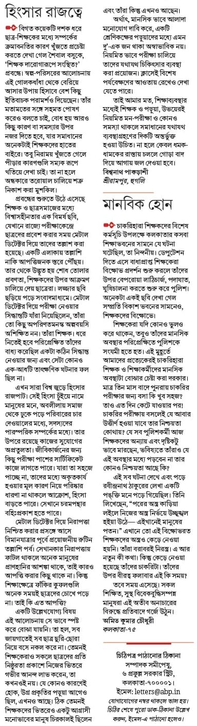 এই সব ঘটনা দেখে এবং পড়ে রবীন্দ্রনাথ ঠাকুরের লেখা একটি পঙ্ক্তি মনে পড়ে গিয়েছিল। তিনি লিখেছেন, “পরের অস্ত্র কাড়িয়া লইলে নিজের অস্ত্র নির্ভয়ে উচ্ছৃঙ্খল হইয়া উঠে— এইখানেই মানুষের পতন।” এখানে তো এই বিক্ষোভরত শিক্ষকদের অস্ত্রও কেড়ে নেওয়া হয়নি। তাঁরা বরাবরই নিরস্ত্র। এ আর নতুন কী কথা। কিন্তু কেড়ে নেওয়া হয়েছে তাঁদের চাকরিটা। তাঁদের উপর বীরত্ব ফলাবার এই কি সময়?