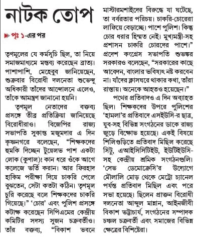 পথের প্রতিবাদও এ দিন অব্যাহত ছিল। শিক্ষকদের উপরে পুলিশের ‘হামলা’র প্রতিবাদে এসইউসি-র ছাত্র, যুব-সহ বিভিন্ন সংগঠনের ডাকে রাজ্য জুড়ে বিক্ষোভ হয়েছে। একই বিষয়ে শিলিগুড়িতে প্রতিবাদ মিছিল করেছে সিটু, এআইসিসিটিইউ, ইউটিইউসি-সহ কেন্দ্রীয় শ্রমিক সংগঠনগুলি। ‘সেভ ডেমোক্রেসি’র উদ্যোগে মৌলালি মোড় থেকে মেট্রো চ্যানেল পর্যন্ত প্রতিবাদ মিছিল এবং পরে সভা হয়েছে। ছিলেন প্রাক্তন বিরোধী দলনেতা আব্দুল মান্নান, আইনজীবী বিকাশ ভট্টাচার্য, সংগঠনের সম্পাদক চঞ্চল চক্রবর্তী এবং সমাজের বিভিন্ন ক্ষেত্রের বিশিষ্টেরা।