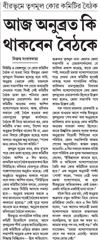 তৃণমূল সূত্রের খবর, প্রায় দু’মাস পরে ফের ডাকা হয়েছে কোর কমিটির বৈঠক। আশিস এ দিন জানান, প্রাথমিক ভাবে বৈঠক হওয়ার কথা ছিল সিউড়িতে। রবিবার বোলপুরে সৌরভ গঙ্গোপাধ্যায়ের অনুষ্ঠান রয়েছে। সেই অনুষ্ঠানে অনুব্রতও থাকতে পারেন বলে খবর। আশিস বলেন, “সিউড়িতে কোর কমিটির বৈঠক বসলে, বোলপুর থেকে সময়ে সিউড়ি আসতে সমস্যা হবে— অনুব্রত মণ্ডলের তরফে এ কথা জানানোর পরেই বৈঠকের জায়গা বদলানো হয়েছে।” সেই সূত্রে দলের অনেকে মনে করছেন, অনুব্রত হয়তো রবিবারের বৈঠকে থাকবেন।
