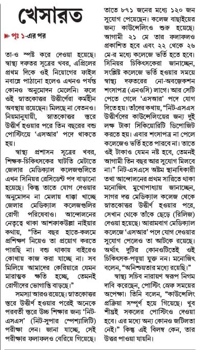 স্বাস্থ্য প্রশাসন সূত্রের খবর, শিক্ষক-চিকিৎসকের ঘাটতি মেটাতে জেলার মেডিক্যাল কলেজগুলিতে এখন সিনিয়র রেসিডেন্ট পদ বাড়ানো হয়েছে। কিন্তু তাতে যোগ দেওয়ার অনুমোদন না মেলায় ধাক্কা খাচ্ছে জেলার মেডিক্যাল কলেজগুলির রোগী পরিষেবাও। আন্দোলনের নেতৃত্বে থাকা আশফাকউল্লা নাইয়ার কথায়, “তিন বছর হাতে-কলমে প্রশিক্ষণ নিয়েও তা প্রয়োগ করতে পারছি না। বন্ড থাকায় বাইরেও কোথায় কাজ করা যাচ্ছে না। সব মিলিয়ে আমাদের কেরিয়ারে যেমন মারাত্মক ক্ষতি হচ্ছে, তেমনই রোগীদের ভোগান্তি বাড়ছে।”