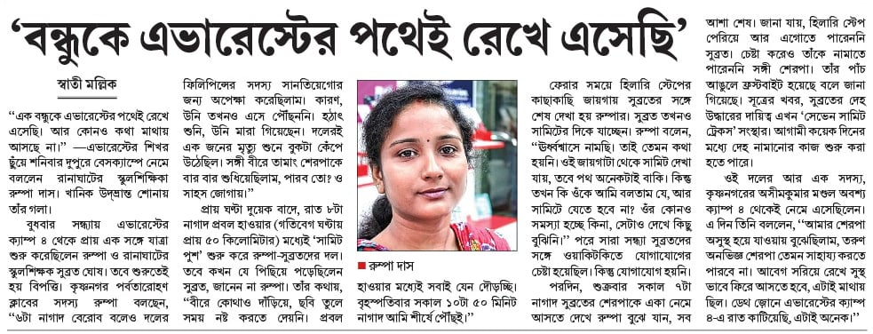 বুধবার সন্ধ্যায় এভারেস্টের ক্যাম্প ৪ থেকে প্রায় এক সঙ্গে যাত্রা শুরু করেছিলেন রুম্পা ও রানাঘাটের স্কুলশিক্ষক সুব্রত ঘোষ। তবে শুরুতেই হয় বিপত্তি। কৃষ্ণনগর পর্বতারোহণ ক্লাবের সদস্য রুম্পা বলছেন, ‘‘৬টা নাগাদ বেরোব বলেও দলের ফিলিপিন্সের সদস্য সানতিয়েগোর জন্য অপেক্ষা করেছিলাম। কারণ, উনি তখনও এসে পৌঁছননি। হঠাৎ শুনি, উনি মারা গিয়েছেন। দলেরই এক জনের মৃত্যু শুনে বুকটা কেঁপে উঠেছিল। সঙ্গী বীরে তামাং শেরপাকে বার বার শুধিয়েছিলাম, পারব তো? ও সাহস জোগায়।’’