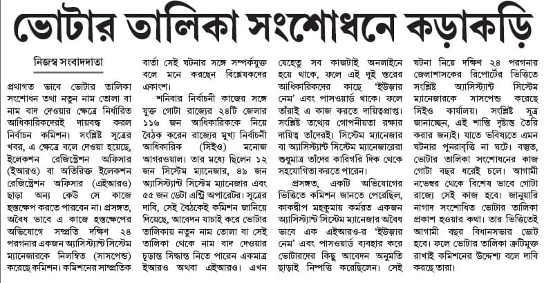 প্রসঙ্গত, একটি অভিযোগের ভিত্তিতে কমিশন জানতে পেরেছিল, কাকদ্বীপ মহকুমায় কর্মরত একজন অ্যাসিস্ট্যান্ট সিস্টেম ম্যানেজার অবৈধ ভাবে এক এইআরও-র ‘ইউজ়ার নেম’ এবং পাসওয়ার্ড ব্যবহার করে ভোটারদের কিছু আবেদন অনুমতি ছাড়াই নিষ্পত্তি করেছিলেন। সেই ঘটনা নিয়ে দক্ষিণ ২৪ পরগনার জেলাশাসকের রিপোর্টের ভিত্তিতে সংশ্লিষ্ট অ্যাসিস্ট্যান্ট সিস্টেম ম্যানেজারকে সাসপেন্ড করেছে