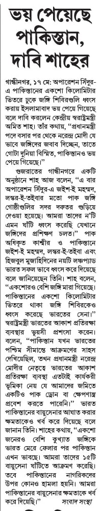 গান্ধীনগর, ১৭ মে: অপারেশন সিঁদুর-এ পাকিস্তানের একশো কিলোমিটার ভিতরে ঢুকে জঙ্গি শিবিরগুলি ধ্বংস করায় ইসলামাবাদ ভয় পেয়ে গিয়েছে বলে দাবি করলেন কেন্দ্রীয় স্বরাষ্ট্রমন্ত্রী অমিত শাহ। তাঁর কথায়, ‘‘প্রধানমন্ত্রী পদে বসার পর থেকে নরেন্দ্র মোদী যে ভাবে জঙ্গিদের জবাব দিচ্ছেন, তাতে গোটা দুনিয়া বিস্মিত, পাকিস্তানও ভয় পেয়ে গিয়েছে।’’