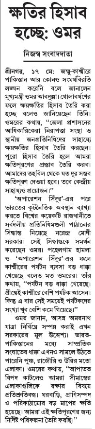 ওমর জানান, আসন্ন অমরনাথ যাত্রা নির্বিঘ্নে সম্পন্ন করাই এখন সরকারের মূল উদ্দেশ্য। ভারত-পাকিস্তানের মধ্যে সাম্প্রতিক সংঘাতের ধাক্কা এখনও সামলে উঠতে পারেনি পুঞ্চ, রাজৌরি ও উরির মতো এলাকা। ওমরের কথায়, ‘‘আপাতত বিপদ কাটলেও আমরা সীমান্তের এলাকাগুলিকে রক্ষার বিষয়ে প্রতিশ্রুতিবদ্ধ। ঘরবাড়ি, প্রাণিসম্পদ ও পরিকাঠামোর বড় মাপের ক্ষতি হয়েছে। আমরা এই ক্ষতিপূরণের জন্য নির্দিষ্ট পরিকল্পনা তৈরি করছি।’’