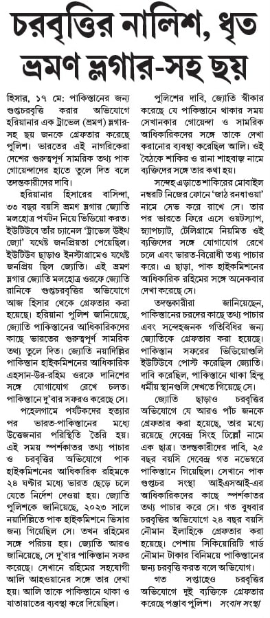 হরিয়ানার হিসারের বাসিন্দা, ৩৩ বছর বয়সি ভ্রমণ ভ্লগার জ্যোতি মলহোত্র পর্যটন নিয়ে ভিডিয়ো করত। ইউটিউবে তাঁর চ্যানেল ‘ট্রাভেল উইথ জ্যো’ যথেষ্ট জনপ্রিয়তা পেয়েছিল। ইউটিউব ছাড়াও ইনস্টাগ্রামেও যথেষ্ট জনপ্রিয় ছিল জ্যোতি। এই ভ্রমণ ভ্লগার জ্যোতি মলহোত্র ওরফে জ্যোতি রানিকে গুপ্তচরবৃত্তির অভিযোগে আজ হিসার থেকে গ্রেফতার করা হয়েছে। হরিয়ানা পুলিশ জানিয়েছে, জ্যোতি পাকিস্তানের আধিকারিকদের কাছে ভারতের গুরুত্বপূর্ণ সামরিক তথ্য তুলে দিত। জ্যোতি নয়াদিল্লির পাকিস্তান হাইকমিশনের আধিকারিক এহসান-উর-রহিম ওরফে দানিশের সঙ্গে যোগাযোগ রেখে চলত। পাকিস্তানে দু’বার সফরও করেছে সে।