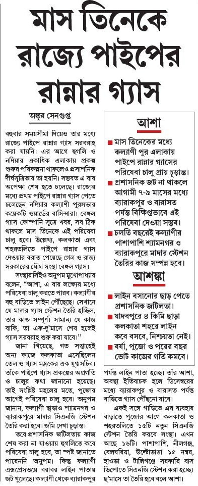 জানা গিয়েছে, গত সপ্তাহেই অন্য কাজে কলকাতা এসেছিলেন তেল ও গ্যাস মন্ত্রকের এক যুগ্মসচিব। তাঁকে পাইপে গ্যাস প্রকল্পের অগ্রগতি ও চালুর কথা জানানো হয়েছে। তাই সংশ্লিষ্ট মহলের মতে, পুজোর আগেই পরিষেবা চালু হবে। অনুপম জানান, কল্যাণী ছাড়াও শ্যামনগর ও ব্যারাকপুরে মাদার সিএনজি স্টেশন তৈরি করা হবে। জমি দেখা চূড়ান্ত।