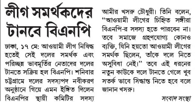 ঢাকা, ১৭ মে: আওয়ামী লীগ নিষিদ্ধ হতেই সেই দলের সমর্থক এবং পরিচ্ছন্ন ভাবমূর্তির নেতাদের দলের টানতে সক্রিয় হল বিএনপি। শনিবার চট্টগ্রামে দলের সদস্যপদ নবীকরণ অনুষ্ঠানে গিয়ে এমন ইঙ্গিত দিলেন বিএনপির স্থায়ী কমিটির সদস্য আমীর খসরু চৌধুরী। তিনি বলেন, ‘‘আওয়ামী লীগের চিহ্নিত সঙ্গীরা বিএনপি-র সদস্য হতে পারবেন না। তবে সমাজে গ্রহণযোগ্য কোনও ব্যক্তি, যিনি হয়তো আওয়ামী লীগের সমর্থক ছিলেন, তাঁকে দলে নিতে অসুবিধা নেই।’’ তবে এই ধরনের নতুন কাউকে দলে টানতে গেলে খুব সতর্ক ভাবে সিদ্ধান্ত নিতে হবে বলে জানান খসরু।