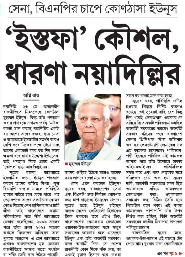 নয়াদিল্লি, ২৩ মে: অভ্যন্তরীণ রাজনীতিতে নিঃসন্দেহে কোণঠাসা মুহাম্মদ ইউনূস। কিন্তু তাঁর পদত্যাগ করার প্রচারকে এখনও পর্যন্ত ‘নাটক’ বলেই মনে করছে নয়াদিল্লির একটা বড় অংশ। তাদের বক্তব্য, ছাত্র নেতা ও জামায়াতে ইসলামীর সমর্থন আরও বেশি করে নিজের পক্ষে টেনে এবং তাদের একজোট করে যত দিন সম্ভব ক্ষমতা ধরে রাখার উদ্দেশ্য ইউনূসের। তাই পদত্যাগ নিয়ে প্রচার একটি ‘কৌশল’ ছাড়া আর কিছুই নয়।