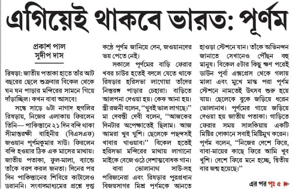 সন্ধে সাড়ে ৬টা নাগাদ হুগলির রিষড়ায়, নিজের এলাকায় ফিরলেন তিনি— পাকিস্তানে ২১ দিন বন্দি থাকা সীমান্তরক্ষী বাহিনীর (বিএসএফ) জওয়ান পূর্ণমকুমার সাউ। ফিরলেন বন্দি হওয়ার ঠিক এক মাসের মাথায়। জাতীয় পতাকা, ফুল-মালা, ব্যান্ডে তাঁকে বরণ করল জনতা। দিনের পর দিন পাকিস্তানের শিবিরে কাটালেও ডরাননি। সংবাদমাধ্যমের প্রশ্নে দৃপ্ত কণ্ঠে পূর্ণম জানিয়ে দেন, জওয়ানদের ভয় পেতে নেই।