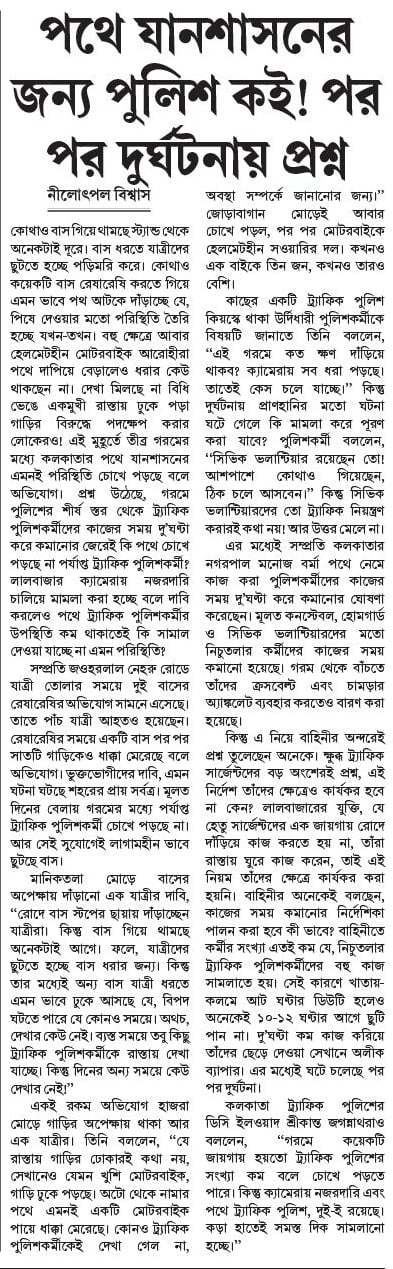 কলকাতা ট্র্যাফিক পুলিশের ডিসি ইলওয়াদ শ্রীকান্ত জগন্নাথরাও বললেন, ‘‘গরমে কয়েকটি জায়গায় হয়তো ট্র্যাফিক পুলিশের সংখ্যা কম বলে চোখে পড়তে