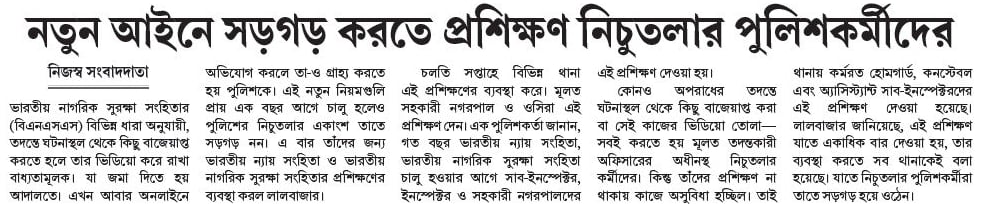 চলতি সপ্তাহে বিভিন্ন থানা এই প্রশিক্ষণের ব্যবস্থা করে। মূলত সহকারী নগরপাল ও ওসিরা এই প্রশিক্ষণ দেন। এক পুলিশকর্তা জানান, গত বছর ভারতীয় ন্যায় সংহিতা, ভারতীয় নাগরিক সুরক্ষা সংহিতা চালু হওয়ার আগে সাব-ইনস্পেক্টর, ইনস্পেক্টর ও সহকারী নগরপালদের এই প্রশিক্ষণ দেওয়া হয়।
