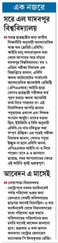 }} সমস্ত ছাত্রছাত্রীর জন্য জাতীয় শিক্ষানীতি অনুসারী অ্যাকাডেমিক ব্যাঙ্ক অব ক্রেডিট (এবিসি) আইডি চালু বাধ্যতামূলক করা থেকে আপাতত সরে দাঁড়াল যাদবপুর বিশ্ববিদ্যালয়। গত ৭ এপ্রিল পরীক্ষা নিয়ামক এক বিজ্ঞপ্তিতে জানান, এবিসি অথবা অটোমেটেড পার্মানেন্ট অ্যাকাডেমিক অ্যাকাউন্ট রেজিস্ট্রি (এপিএএআর) আইডি ছাড়া কোনও ছাত্রছাত্রী পরীক্ষার ফর্ম পূরণ করতে অথবা অ্যাডমিট কার্ড নিতে পারবেন না। এই নির্দেশিকায় আপত্তি জানান পড়ুয়াদের একাংশ এবং শিক্ষক সংগঠন আবুটা। তাদের বক্তব্য ছিল, ইউজিসি-র বিধি অনুযায়ী এবিসি-তে নাম নথিভুক্ত করা সম্পূর্ণ ঐচ্ছিক। এর পরেই পরীক্ষা নিয়ামক জানান, কোনও পড়ুয়া ইচ্ছুক না হলে এবিসি অথবা এপিএএআর আইডি না-ও দিতে পারেন। তবে এ-ও জানানো হয়েছে, নম্বর আপলোডের ক্ষেত্রে এই আইডি খুবই গুরুত্বপূর্ণ।