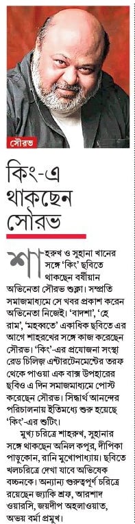 শাহরুখ ও সুহানা খানের সঙ্গে ‘কিং’ ছবিতে থাকছেন বর্ষীয়ান অভিনেতা সৌরভ শুক্লা। সম্প্রতি সমাজমাধ্যমে সে খবর প্রকাশ করেন অভিনেতা নিজেই। ‘বাদশা’, ‘হে রাম’, ‘মহব্বতে’ একাধিক ছবিতে এর আগে শাহরখের সঙ্গে কাজ করেছেন সৌরভ। ‘কিং’-এর প্রযোজনা সংস্থা রেড চিলিজ় এন্টারটেনমেন্টের তরফ থেকে পাওয়া এক বাক্স উপহারের ছবিও এ দিন সমাজমাধ্যমে পোস্ট করেছেন সৌরভ। সিদ্ধার্থ আনন্দের পরিচালনায় ইতিমধ্যে শুরু হয়েছে ‘কিং’-এর শুটিং।